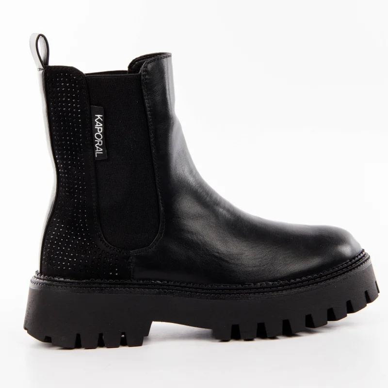 Bottines Chelsea Crissy KAPORAL en cuir noir – Élégance et confort au quotidien. Affirmez votre style avec ces bottines Chelsea noires pour femme signées KAPORAL, alliant allure intemporelle et praticité. Confectionnées en cuir de qualité, elles offrent un chaussant confortable et un design minimaliste, idéal pour toutes les occasions.