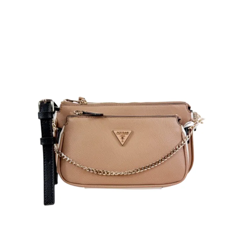 Découvrez le Mini Sac à Bandoulière Noelle Guess pour Femme en marron, un accessoire compact et polyvalent qui allie élégance et praticité. Fabriqué en faux cuir texturé Saffiano (100 % polyuréthane), ce sac arbore une finition structurée avec des détails en métal or pâle et un logo triangulaire en métal sur le devant, parfait pour un style casual chic.